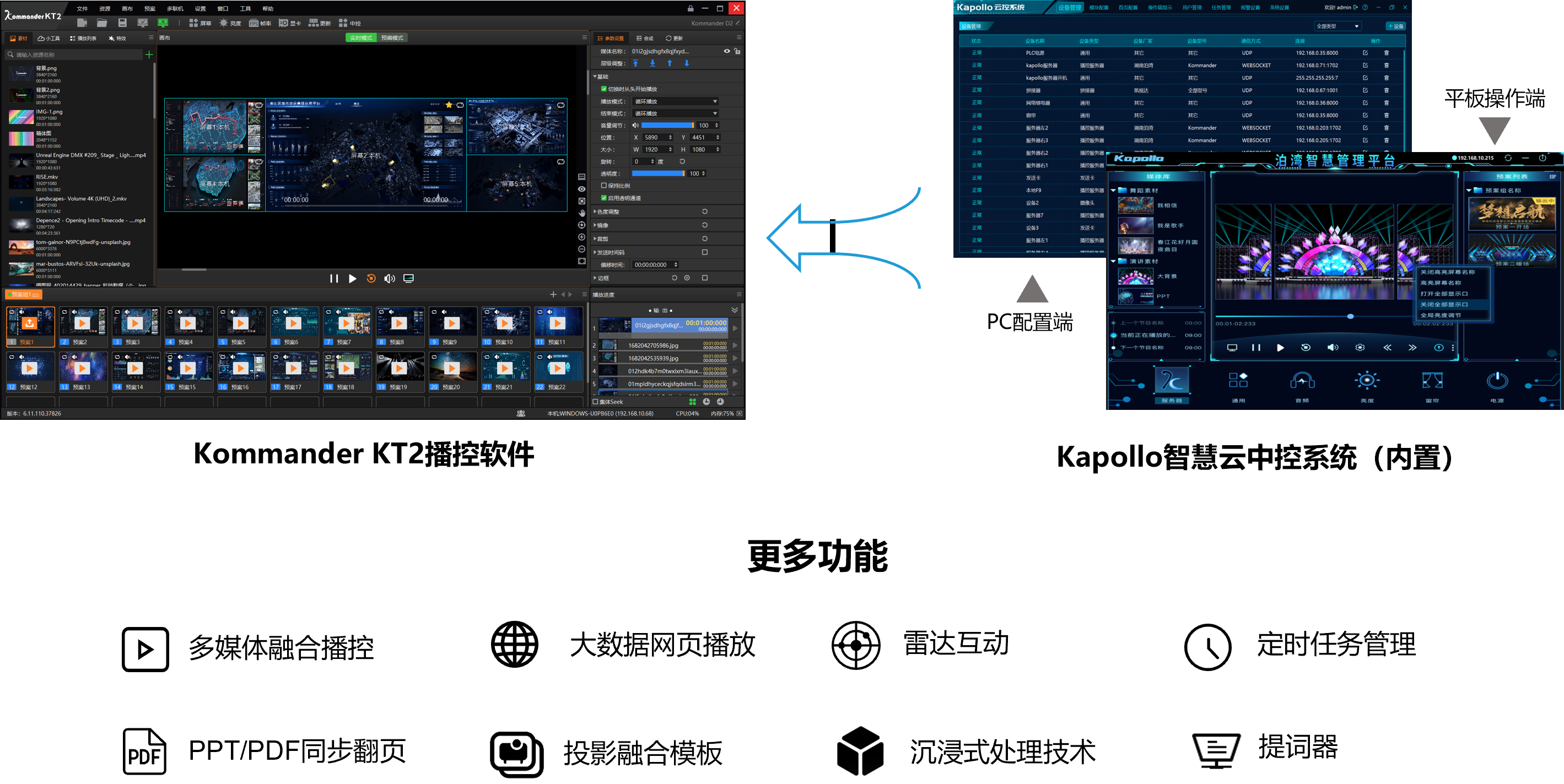 内置可视化云中控系统,移动平板/手机实时回显监视,实时切换节目和声光电集控;