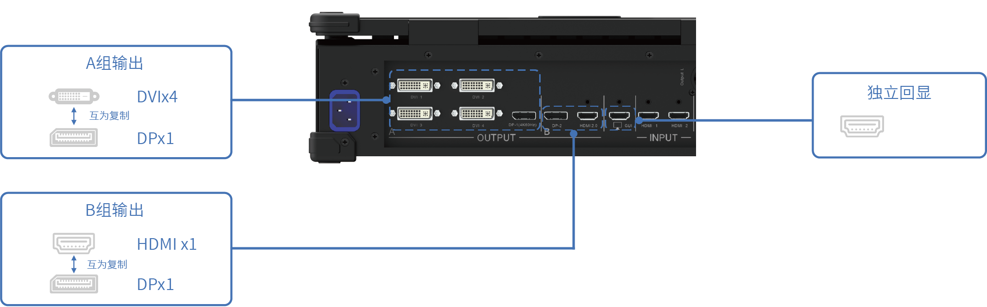 A组单路DVI最大支持1920*1200@60Hz,可单独输出完整画面,拼接后的画面与DP-1互为复制,B组DP-2与HDMI2.0最大均为3840*2400@60Hz输出,两者互为复制;一路2K-HDMI独立回显