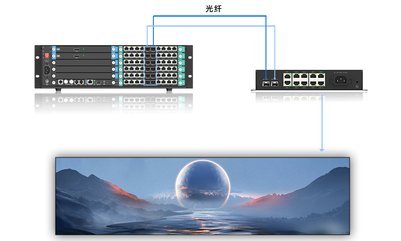 6路光纤输出或48路网口输出, 单机最大支持3120万像素点带载, 实现超宽拼接、异形划分等多样布局。