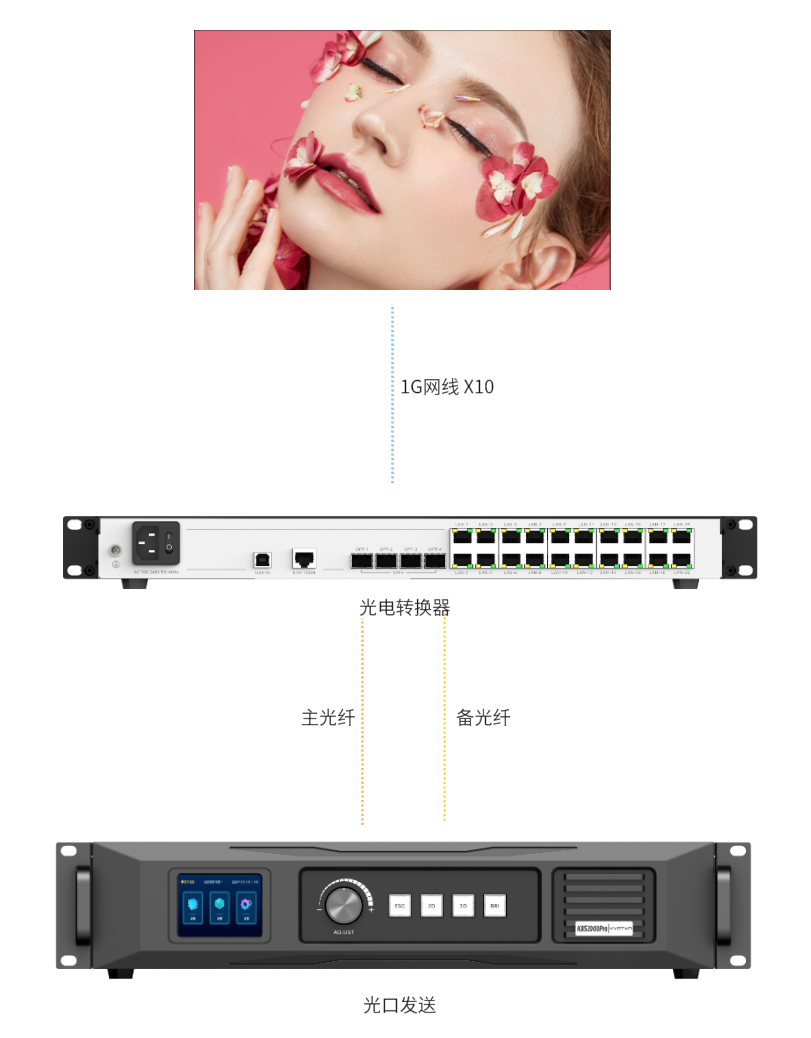 支持10Gbps速率稳定传输,1路光纤转10路网口进行显示屏带载,有效精简布线。